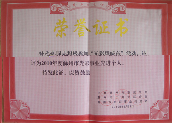 会议对今年度滁州市光彩事业先进个人和全市工商联系统优秀民营企业、先进单位、先进个人进行表彰。“光彩耀皖东”活动中金鹏建设集团董事长孙元武被评为2010年度滁州市光彩事业先进个人,金鹏建设集团项目经理李明松被荣获全市工商联系统热爱企业优秀员工光荣称号。市委副书记张裕发出席会议并讲话。市人大常委会副主任贾朝峰,副市长王图强,市政协副主席孙敏民参加会议并颁奖。市政协副主席、市工商联主席徐崇华在会上作工作报告,鼓励非公企业家在新的一年里做出更好的成绩。