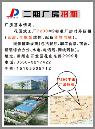 花园式工厂7200M2标准厂房对外招租(三层、全框架、配备货物电梯)提供辅助设施(包括餐厅、职工食堂、宿舍、精装综合办公、水电、电话线、网线到位)地址:滁州市开发区花山东路2999号电话:0550-3217422