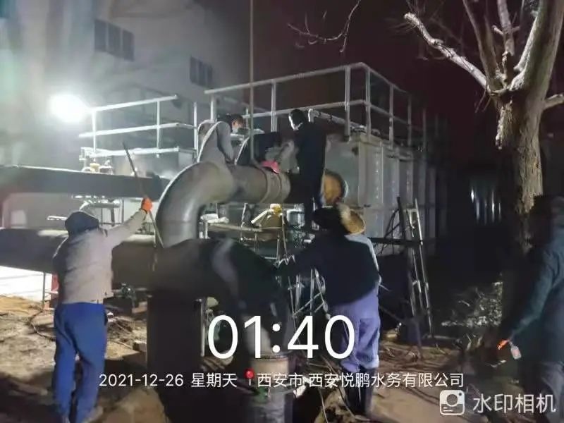 为了协助政府解决问题,中鹏环保立即协调相关公司从河北现场调运2套1万吨/日应急处理设施抵达现场,总经理姜学明、副经理王菊明、智能科技分公司副总经理李光磊及所有维修班成员快速行动,细化责任分工、调配车辆设备、采购管材配件……将准备工作全部到位,积极配合应急设备厂家组织安装到位。就在西安“封城”第三天,一场大雪席卷西安,所有人员却坚守一线,12月25日早上8点直至26日凌晨2点,从设备就位到进出水管道、加药管道等对接焊接,从电缆放线接线到流量器安装,每一个环节都环环相扣,18个小时,上百米管道,大大小小二十多道焊口,7位施工人员,每个数字都是一份责任、一份担当。