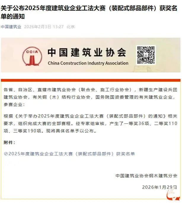 中国建筑业协会是我国建筑工程质量最高荣誉奖——“鲁班奖”的评选组织单位,是行业内公认的权威机构。本次工法大赛同样由该协会主办,旨在将建筑装配式构件标准化施工和生产智能化协同相结合,实现部品标准化、模块化、模数化,提升整体建造效率,推动装配化建造在技术层面的进一步升级。