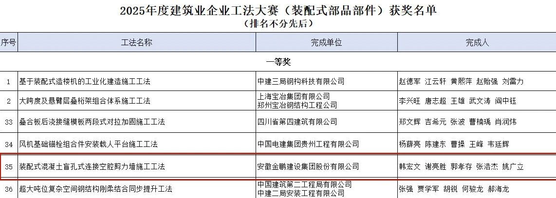 近日,中国建筑业协会公布2025年度建筑业企业工法大赛(装配式部品部件)结果,产生一等奖36项、二等奖110项、三等奖190项。金鹏申报的《装配式混凝土盲孔式连接空腔剪力墙施工工法》凭借其创新性与应用价值,荣获大赛一等奖。