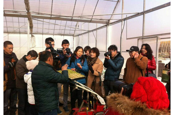 金鹏生态农庄负责人赵登常为艺术家们讲解大棚蔬菜培植情况
