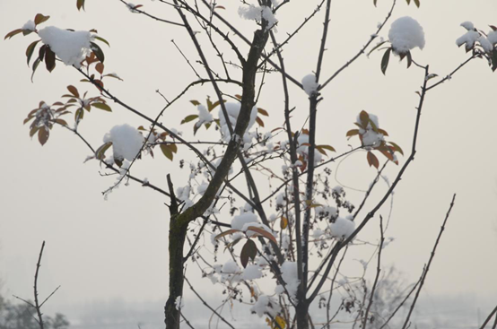 冬日的太阳不是十分耀眼的,好像朦朦胧胧地被一层薄纱罩着,使那火红的身躯淡了许多。抬头看,以往那几棵被北风吹得光秃秃的老树,如今“枯木逢春”般地开满束束银花。在棕黑色树干的衬托下,显得它更加纯洁无瑕。