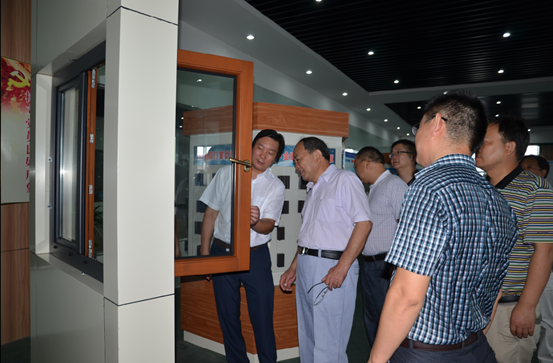 安徽建筑大学、滁州市领导一行在集团公司领导的引领下,首先对安徽金鹏新型建材开发有限公司三楼展厅进行参观。集团副总经理孙元祥、安徽金鹏新型建材开发有限公司总经理吴心勇向各位来宾详细介绍了展厅内各类门窗的材质、功能和特点。