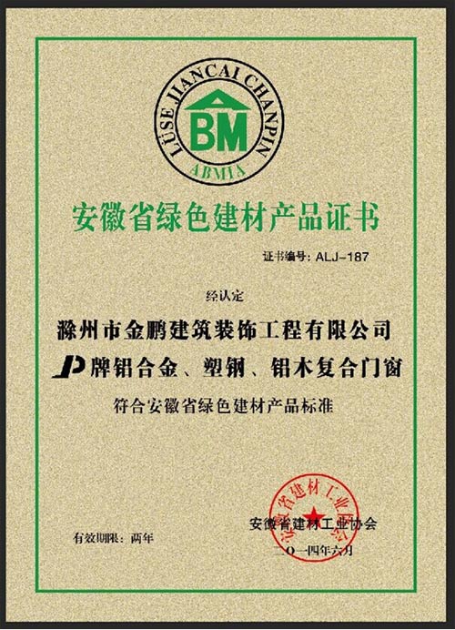 2014年6月,经安徽省建材工业协会认定,金鹏建筑装饰有限公司生产的铝合金、塑钢、铝木复合门窗符合安徽省绿色建材产品标准,荣获“安徽省绿色建材产品证书”。