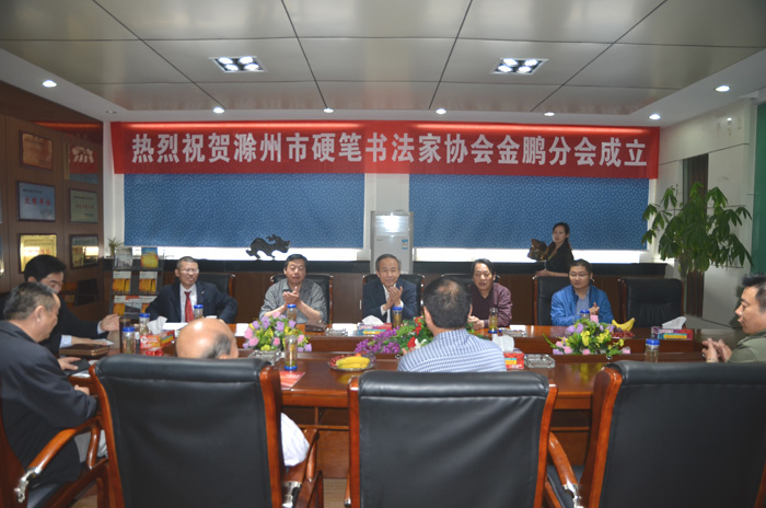 滁州市硬笔书法家协会金鹏分会成立及揭牌仪式于2014年5月9日上午在金鹏建设集团隆重举行,省硬笔书法家协会领导薛祥林、杜继双,市政协领导张忠孝,市硬笔书法家协会主席何建初及协会相关领导十余人出席。