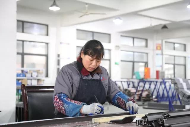 进车间的时候,黄守霞正在给工字框冲孔,面前的工作台上放着加工指令单和几摞工字框。对照着指令单上的数据,她先用卷尺测量间距,再手持电钻钻孔。黄守霞说,工字框是用来组装百叶窗的。她完成得很快,操作步骤都谙熟于心。门窗生产的基本流程是下料、机加工、组角、装配、包装。像组装中挺、穿密封胶条、装配玻璃、安装配件等,只要是人工操作的,黄守霞表示,自己都会。