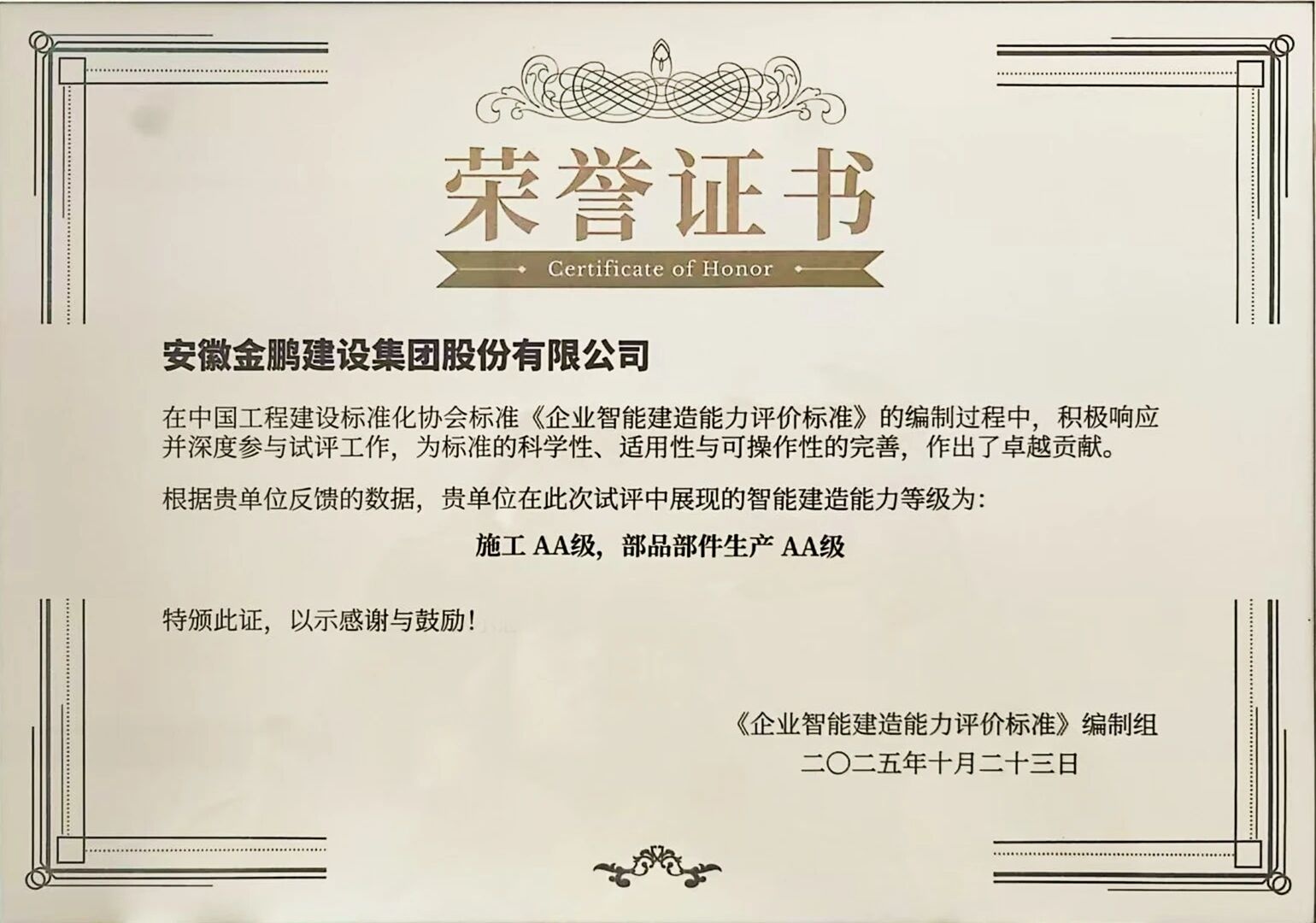 金鹏参编团体标准发布 获企业智能建造能力双 A 认证 金鹏智能建造实力获业界认可