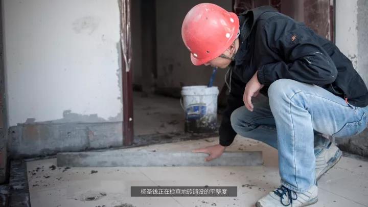 午餐时间班组师傅们都去吃饭了,杨圣钱依然在楼栋里检查施工质量,问他为什么不等下午上班的时候再来检查,他说“师傅们刚刚铺设完成的地砖,我在检查平整度,如有不合标准的情况,我就立刻安排工人重新整改,整改时间拖延久了就可能会造成材料浪费。”