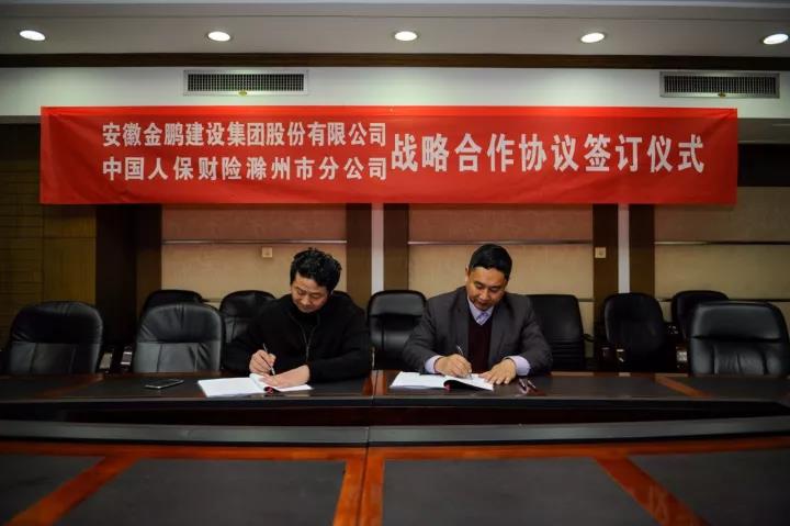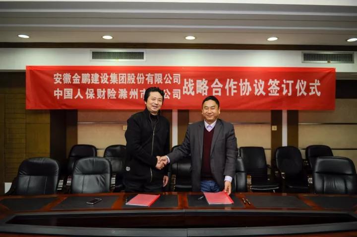 2017年11月15日下午16时,安徽金鹏建设集团股份有限公司与中国人保财险滁州分公司战略合作签约仪式在人保大厦六楼举行。金鹏建设集团总经理王恩陆代表金鹏建设集团与中国人保财险滁州分公司总经理曾庆松签署了战略合作协议。
