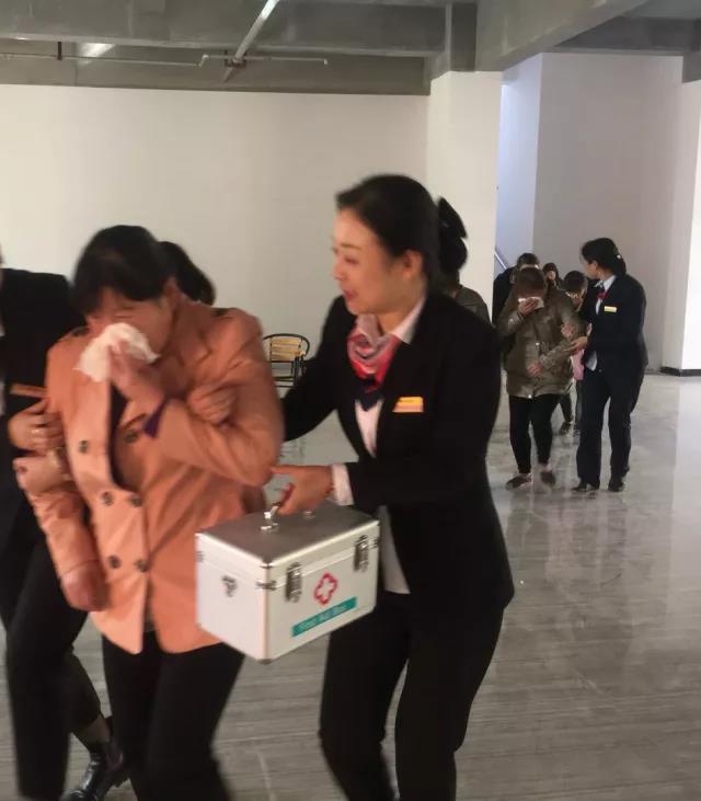 商业楼三楼烟雾“弥漫”,各岗位和消防疏散员迅速到位,引导安全疏散,员工们弯着腰,用湿毛巾捂住口鼻,依照逃生路线迅速从商业楼有序进行紧急疏散,逃至安全集合点。