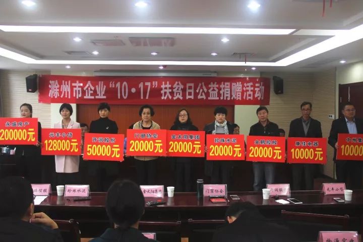 2017年10月17日,滁州市扶贫办、市工商联组织我市部分民营企业开展“10·17”扶贫日公益捐赠活动。金鹏控股集团积极响应政府号召捐赠20000元,为支持扶贫工作,提高贫困人口的幸福感和满意度贡献一份力量。
