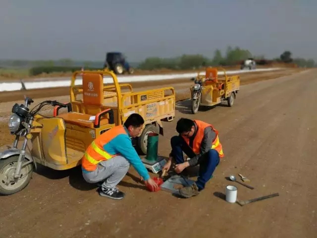 (滁州大道的工程人员在路面进行灌砂实验,测量路基压实度)
