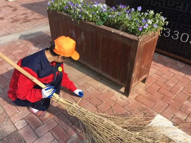 金鹏爱丽舍宫的清洁阿姨认真地用手抠掉扫把清扫不掉的地面垃圾,用实际行动维护小区的环境整洁。