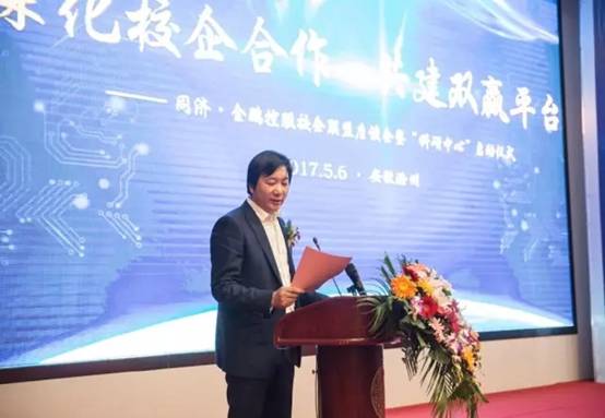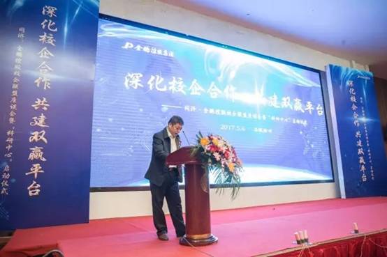 仪式上,金鹏控股集团副总裁、金鹏投资管理公司总经理孙元祥致欢迎辞,向前来参加揭牌仪式的各位领导、来宾表示欢迎和感谢。孙元祥副总从产业概况、运营方式、人才培养、未来的发展战略等方面介绍了金鹏集团近几年的发展。他指出,安徽金鹏控股集团旗下建设集团、地产集团、装饰集团、文旅集团、物业集团等板块都取得了飞速的发展。近年来,金鹏集团已将人才培养、技术创新提高到企业发展的战略高度,为积极响应政府号召,树立和贯彻落实“创新、协调、绿色、开放、共享”五大发展理念,金鹏集团积极推进企业转型升级,大力发展绿色建筑、装配式建筑,促进建造方式革新,提升企业的核心竞争力。孙总指出,此次产学研合作将以“同济大学·金鹏集团——科技研发中心”的建立为切入点,与同济大学共享人才、技术以及先进的科研成果等资源,不仅有助于集团的人才队伍建设,也为同济大学将科研成果转化为社会生产力创造了便利,为高校学生提供了提升社会实践能力的良好平台。