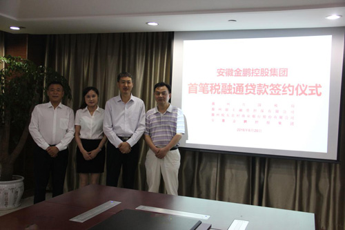 为响应省市领导号召,鼓励实体经济诚信纳税,缓解诚信纳税企业融资难、融资贵的问题,积极贯彻落实省政府《关于金融支持服务实体经济发展的意见》和滁金[2015]72号文件精神,2016年6月20日,安徽金鹏控股集团首笔“税融通”贷款签约仪式在99广场五楼会议室举行,经滁州市国税局、滁州银丰融资担保有限公司、滁州皖东农村商业银行股份有限公司和安徽金鹏控股集团四方共同协商,最终决定授予金鹏控股集团旗下的安徽金鹏建设集团股份有限公司800万元授信贷款。