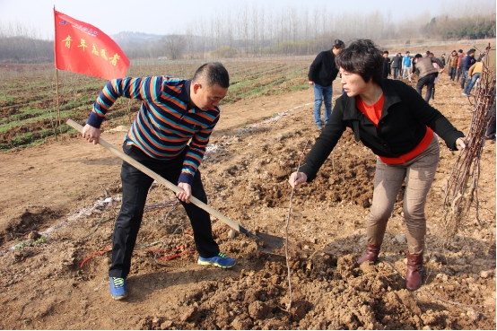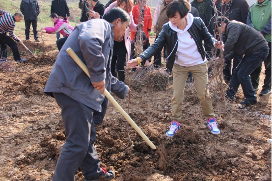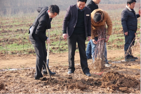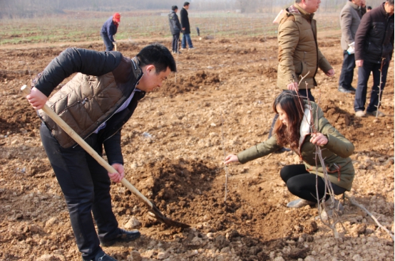 植树现场,首先由生态园果树栽培工程师赵永杰详细介绍了栽植枣树苗的技术要求和规范,然后大家三五人一组,分工合作,挖树洞、拌基肥、扶树苗、培土、压实、打围,忙得不亦乐乎,干的热火朝天。