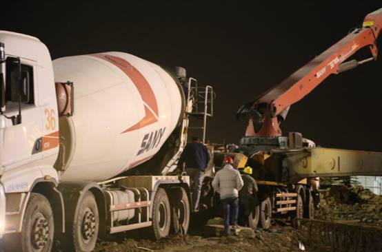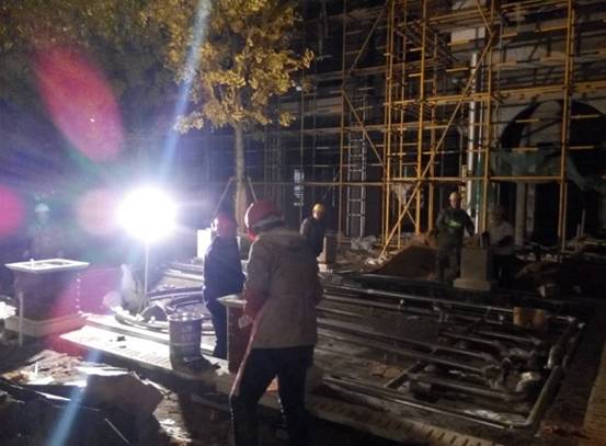 然而,“敢啃硬骨头,不达目的不罢休”是金鹏人一贯的工作作风,专人进驻催促发料,抢晴天战雨天,加班轮班、交叉作业等。在寒冷冬夜的灯光下,看到各自忙碌着的工人们,他们正在挑灯立杆、装腕臂、装吊柱、拌泥浆……他们在争分夺秒。