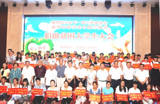 会上,滁州市慈善爱心捐助协会及金鹏建设集团等民营企业为来自各市县的350名优秀贫困学生资助50万元,其中应届贫困大学生100人。