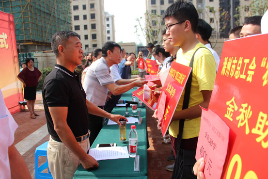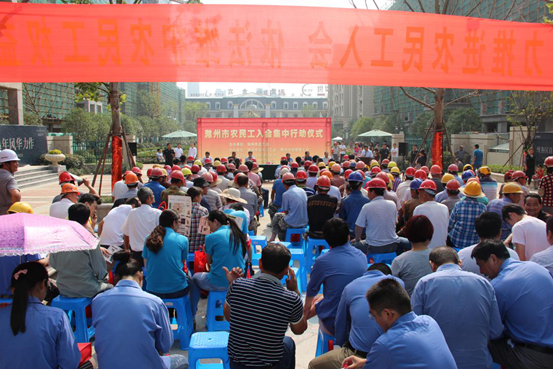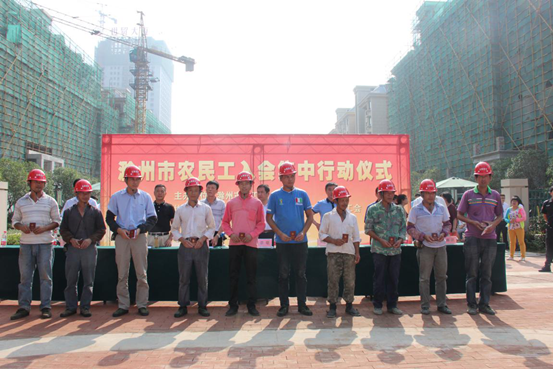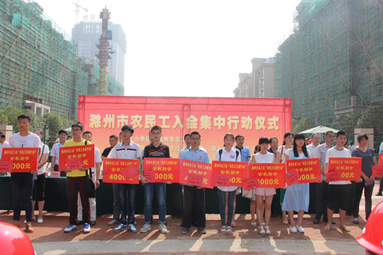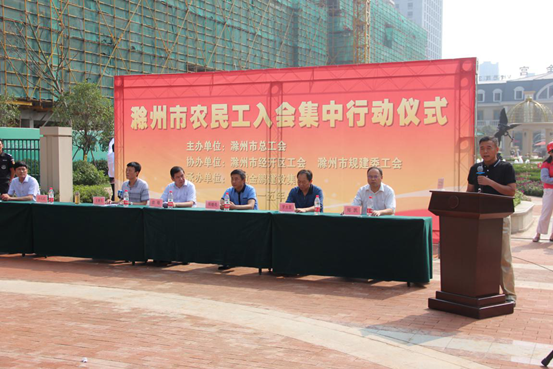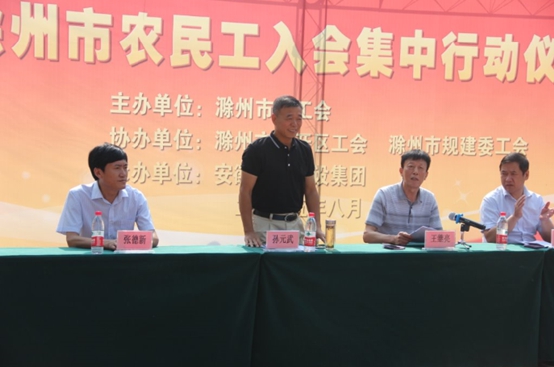 2015年8月26日上午,由滁州市总工会主办、安徽金鹏建设集团承办的 “滁州市农民工入会集中行动仪式” 在金鹏爱丽舍宫工地现场拉开帷幕,这是滁州市开展农民工入会集中行动月的第五场大型农民工入会集中行动,滁州经济技术开发区、滁州市建管处等相关部门同志、安徽金鹏建设集团等7家新入会的260名农民工代表参加仪式,滁州市总工会党组书记、主席崇敬到会并讲话,安徽金鹏建设集团董事长孙元武等领导出席启动仪式。大会由市工会党组成员、经审委主任王继亮主持。
