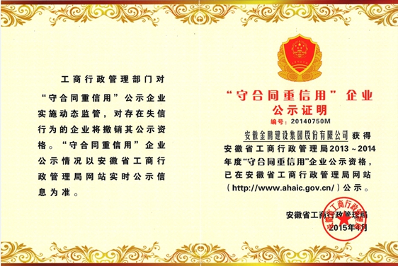 2015年4月,安徽省工商行政管理局公布了2013-2014年度省级“守合同重信用企业”名单,安徽金鹏建设集团股份有限公司光荣上榜。