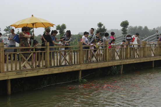 站在临水的木台上,手里拿着鱼儿爱吃的零食,一把洒在水上,看着颜色各异的锦鲤们一个一个争着浮出水面抢夺最爱的鱼食,搅乱了一池静水。小金悄悄告诉你,站在水面拍手,会出现意想不到的画面哦~