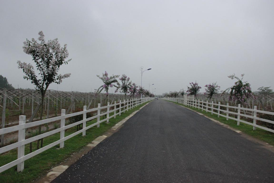 道路两边开着花的树,一些花瓣被雨水打落,干了之后又随风而散,飘远~