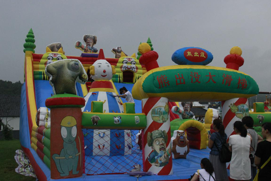 此时的天空一丝细雨,淘气堡上微微的湿润,但是孩子不会管身上是不是会被弄湿,他们只知道玩耍的快乐。