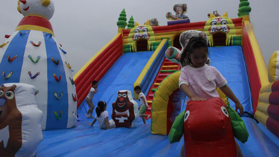 此时的天空一丝细雨,淘气堡上微微的湿润,但是孩子不会管身上是不是会被弄湿,他们只知道玩耍的快乐。
