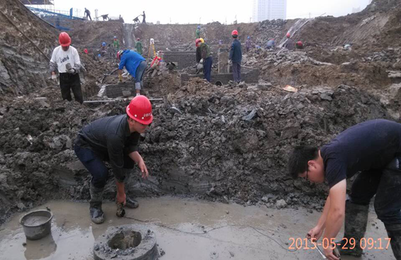 天公不作美,5月份开始连续阴雨天,极大地增加了项目施工的难度。为了在5月4日按期完成围墙施工,完成甲方下达的第一个任务目标,集团董事长孙元武亲自打电话关心指导工作,项目部当晚紧急安排,班组长从滁州、浦口等地紧急调动瓦工130多人,加班加点,终于按期完成围墙砌筑工程。然而一波未平、一波又起,5月24日办理渣土施工许可证时接到通知,由于高考原因,5月25日至6月9日不能出土。为确保满足售楼节点的四栋楼(原合同为三栋楼,临时增加一栋)在25日前出完土方,项目部紧急调入12台挖掘机,60余部渣土车,通宵出土,所有管理人员通宵加班,在5月25日上午7点前成功将四栋楼土方出完,圆满完成任务。