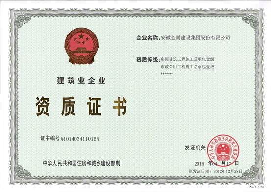 近日,经国家住房和城乡建设部审核批准,安徽金鹏建设集团股份有限公司获得市政公用工程施工总承包一级资质,这标志着公司资质申报工作取得了重大突破。自此,我公司成为房屋建筑与市政公用双一级总承包资质企业。