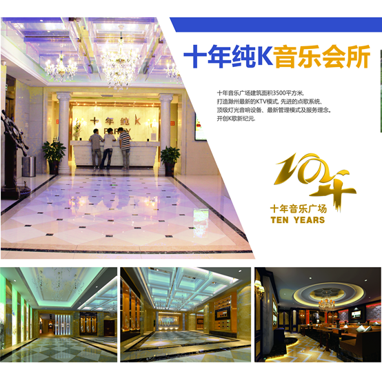 十年音乐广场建筑面积3500平方米,打造滁州最新的KTV模式,先进的点歌系统,顶级灯光音响设备、最新管理模式及服务理念,开创K歌新纪元。