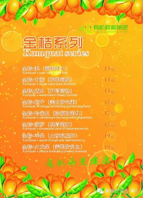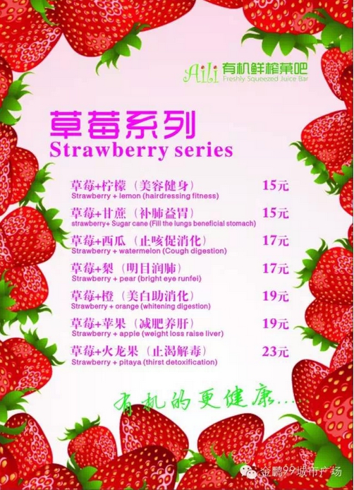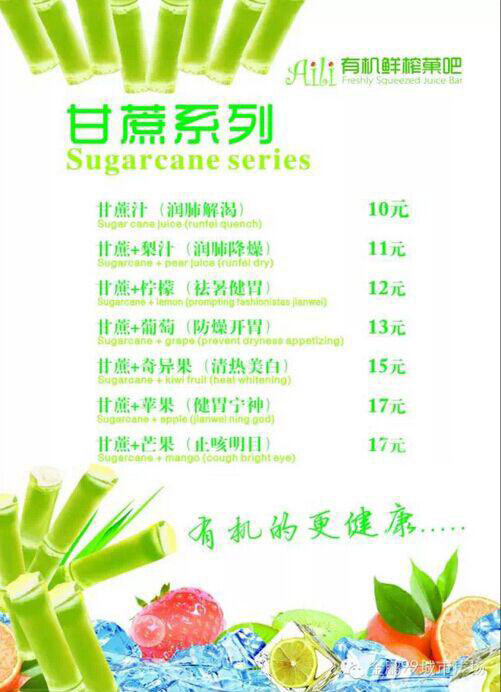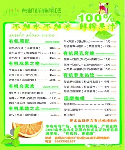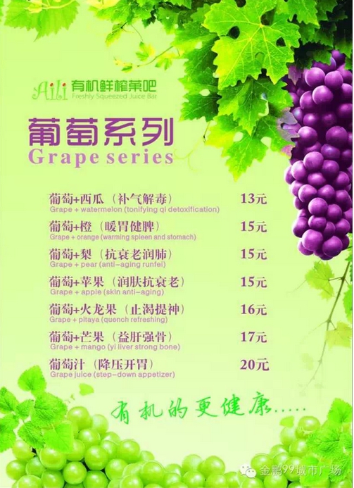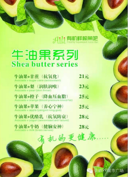 “吃什么补什么”,今天我们要换一种方式,“缺什么喝什么”,快来Aili有机鲜榨菓吧补充能量吧。Aili有机鲜榨菓吧3月27日盛大开业,不加糖、不加水、不加冰,喝出美丽、健康新生活,更多选择尽在有机鲜榨菓吧!