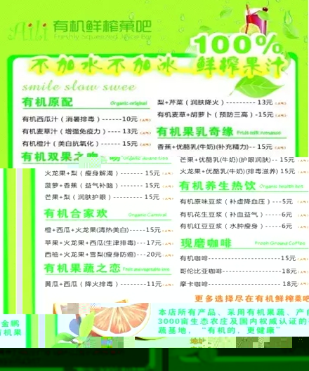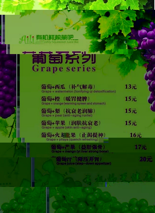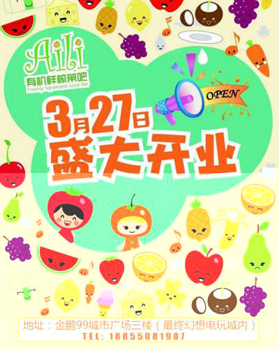 “吃什么补什么”,今天我们要换一种方式,“缺什么喝什么”,快来Aili有机鲜榨菓吧补充能量吧。Aili有机鲜榨菓吧3月27日盛大开业,不加糖、不加水、不加冰,喝出美丽、健康新生活,更多选择尽在有机鲜榨菓吧!