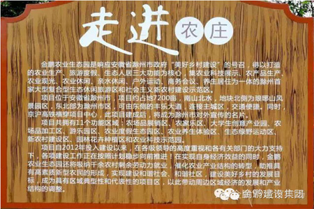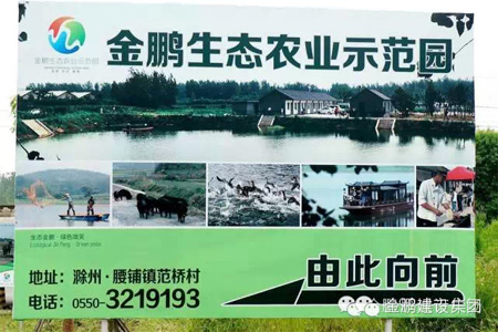 金鹏生态农庄位于滁州市腰铺镇西北区域总面积接近2000亩,​农庄以蔬菜、瓜果等农产品种植,鱼类、家禽家畜养殖为主,土地面积1100多亩,水面500多亩,林地200余亩,是集团农业科研、种植、餐饮、生态养殖、休闲娱乐为一体的综合性绿色农庄。